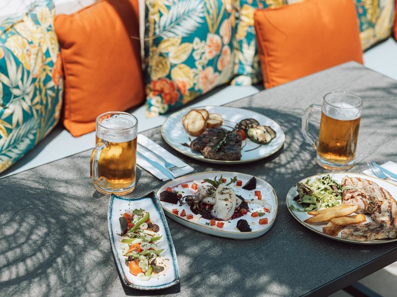 - Hauptrestaurant „Main buffet restaurant“: Küche: griechisch, mediterran, regional, Grillgerichte, glutenfreie Gerichte: ohne Gebühr, lactosefreie Gerichte: ohne Gebühr, vegetarische Gerichte: ohne Gebühr, vegane Gerichte: ohne Gebühr, Buffet, Showcooking, klimatisierbar, mit Terrasse, Kinderhochstuhl