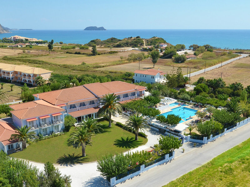 Lage & Umgebung Gelegen in einer ruhigen grünen Umgebung befindet sich das Hotel etwa 300 m vom feinsandigen Strand entfernt. Von hier lassen sich wunderbar die herrliche Natur und die Sehenswürdigkeiten der Insel erkunden. Etwa 6 km sind es zu ihrer sehenswerten Hauptstadt Zakynthos-Stadt.