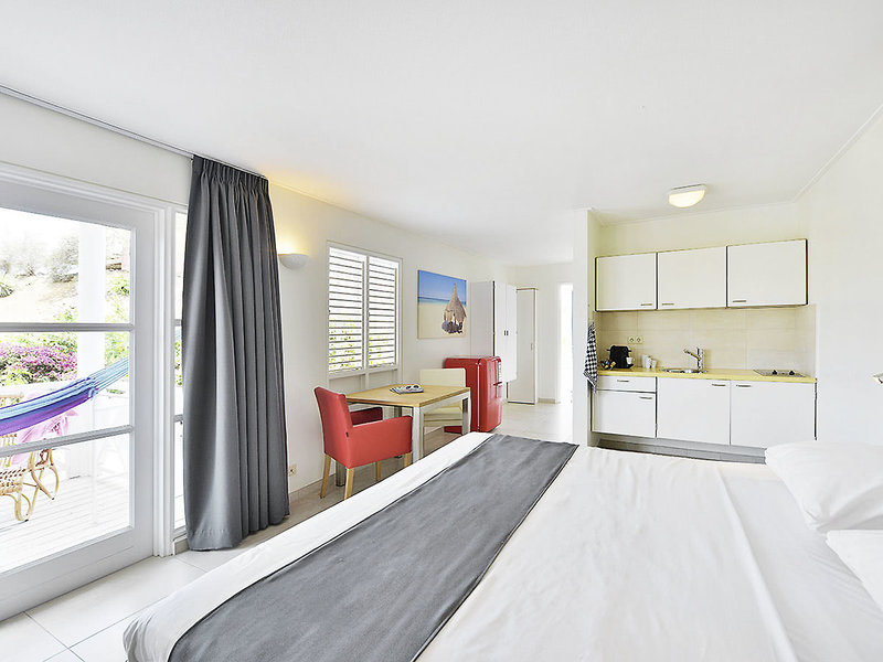 Wohnen: Studio (SA, ca. 42 qm), Klimaanlage, Kitchenette, Kaffeemaschine, WLAN, TV, Telefon und Safe. Regendusche, WC und Föhn. Balkon oder Terrasse mit Hängematte. Max. 2E
