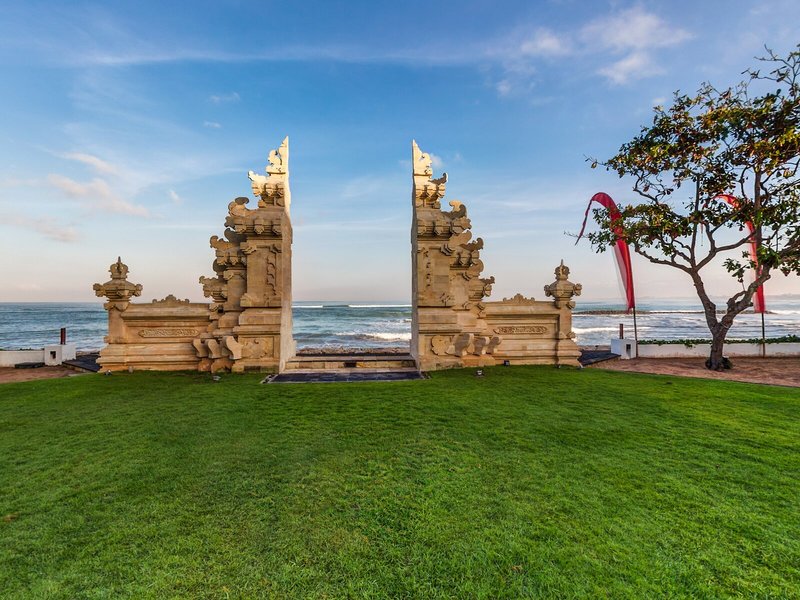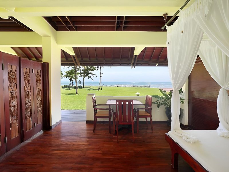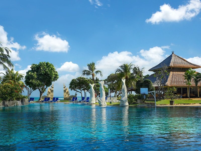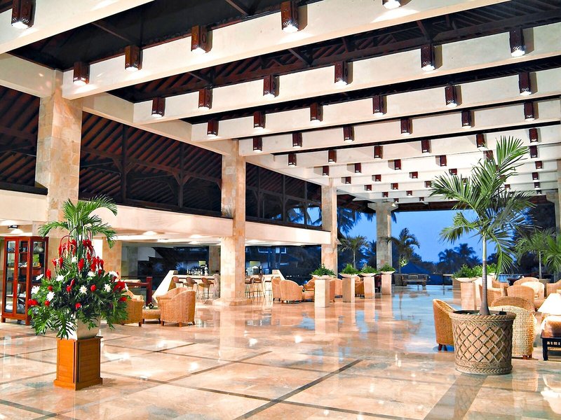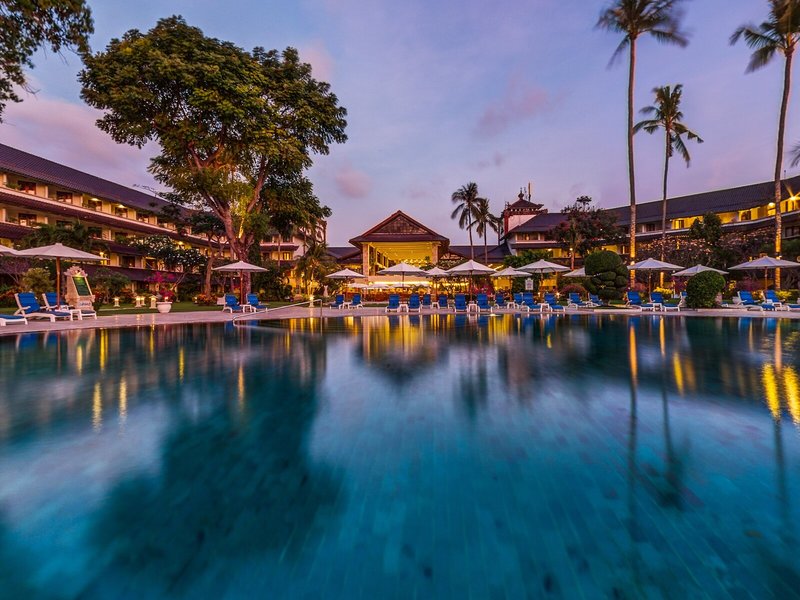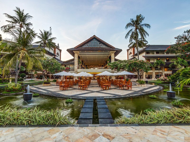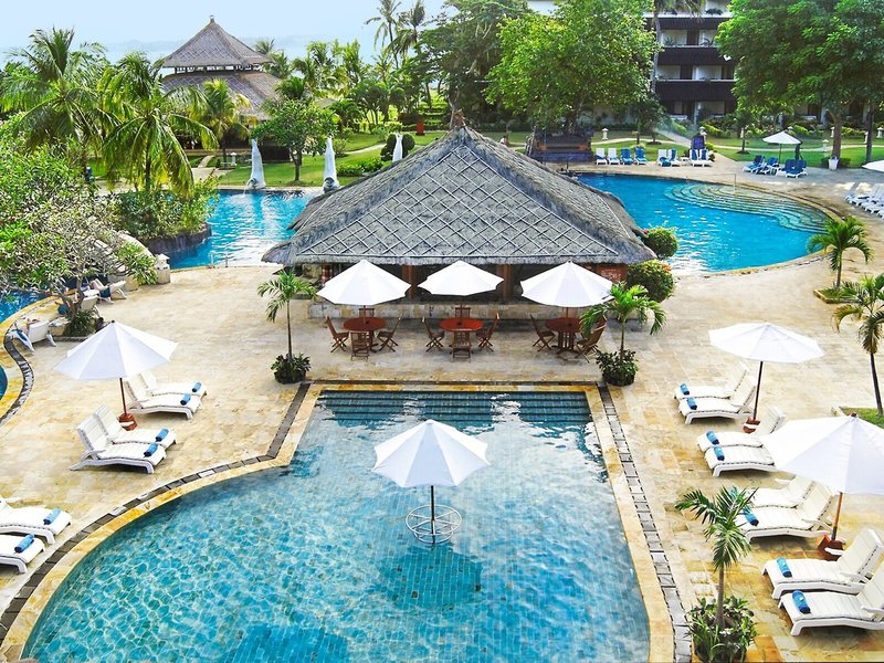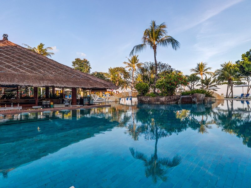 Lage & Umgebung Das Resort liegt inmitten einer Oase von ca. 8 ha weitläufigen, sorgfältig gepflegten tropischen Gärten und befindet sich direkt am beliebten Strand South Kuta Beach. Das Resort ist umgeben von der berühmtesten Sandstrandregion Balis, von Kokospalmen beschattet und voll von charmanter balinesischer Gastfreundschaft. Besonders günstig ist auch die Gehweite zu Geschäften, Restaurants und Unterhaltungsmöglichkeiten. Nach nur wenigen Minuten erreicht man den internationalen Flughafen von Bali, Ngurah Rai.