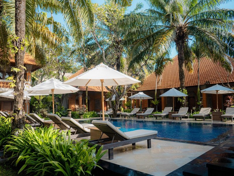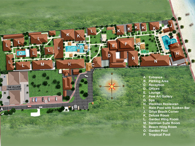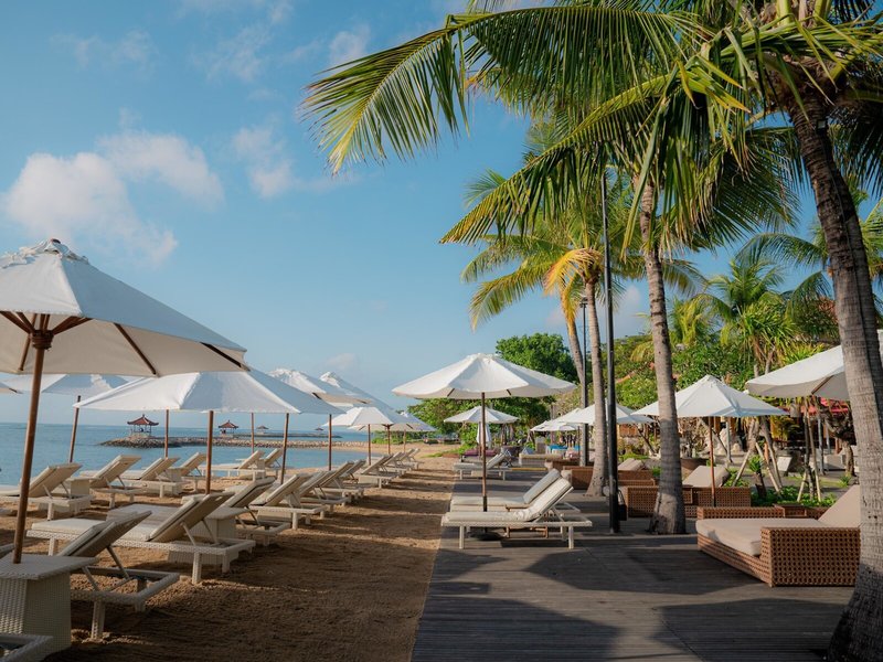 Lage & Umgebung Direkt an einem ruhigen Abschnitt des Sandstrandes von Sanur gelegen. In der Bucht gibt es kaum Brandung, da sie durch ein Riff geschützt wird. Das Baden im Meer ist nur bei Flut möglich. Zahlreiche Geschäfte, Bars und Restaurants befinden sich in der Nähe des Griya Santrian. Das Schwesterhotel Puri Santrian erreicht man nach einem Spaziergang von ca. 1,5 km entlang der Strandpromenade in südlicher Richtung. Zum Flughafen: ca. 15 km. Transferzeit: ca. 40 Minuten.