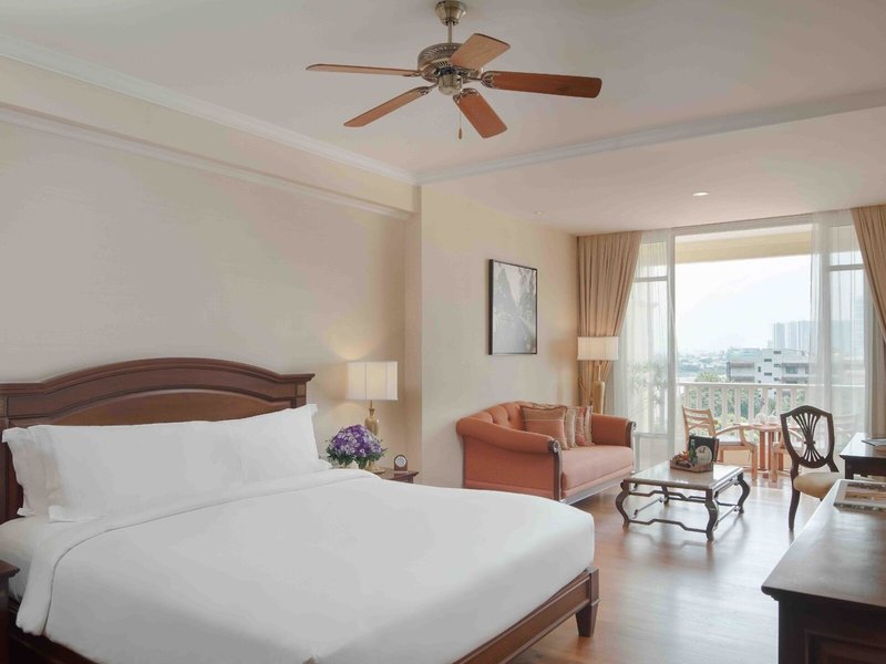 - Luxury Room with Balcony (DZX2), Doppelzimmer, im Hauptgebäude, Flussblick, Stadtblick, ca. 47 - 47 m², letzte Komplettrenovierung 2011, letzte Teilrenovierung 2020, Gesamtanzahl der Räume in diesem Zimmertyp: 1, Aufteilung wie folgt: kombiniertes Wohn-/Schlafzimmer, 1 King Size Bett (180x200cm), 1 Zustellbett (100x180cm), Babybett: ohne Gebühr, Anfrage notwendig, Reservierung nicht notwendig, Klimaanlage: ohne Gebühr, Januar - Dezember, individuell regelbar, kalt, Fußboden: Parkett, Safe: ohne Gebühr, Deckenventilator, Sofa, Schreibtisch, Bügeleisen, Bügelbrett, Kaffee-/Teezubereiter, Wasserkocher, Minibar: ohne Gebühr, Softdrinks: ohne Gebühr, Wasser: ohne Gebühr, alkoholische Getränke: ohne Gebühr, Snacks: gegen Gebühr, Minibarauffüllung: täglich 24 Stunden, Telefon, Internet: WLAN/WiFi: ohne Gebühr, Breitband-Internet/DSL: ohne Gebühr, Fernseher: Flatscreen, im Schlafzimmer, Deutsche Welle, DVD-Player, Roomservice: täglich 24 Stunden, gegen Gebühr, Reinigungsservice: täglich 24 Stunden, ohne Gebühr, Dusche, Badewanne, separates WC, Bademantel: ohne Gebühr, Slipper: ohne Gebühr, Föhn, Kosmetikspiegel, Balkon: mit Sitzgelegenheit