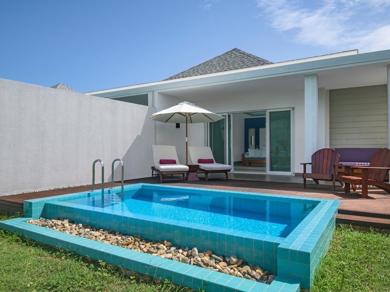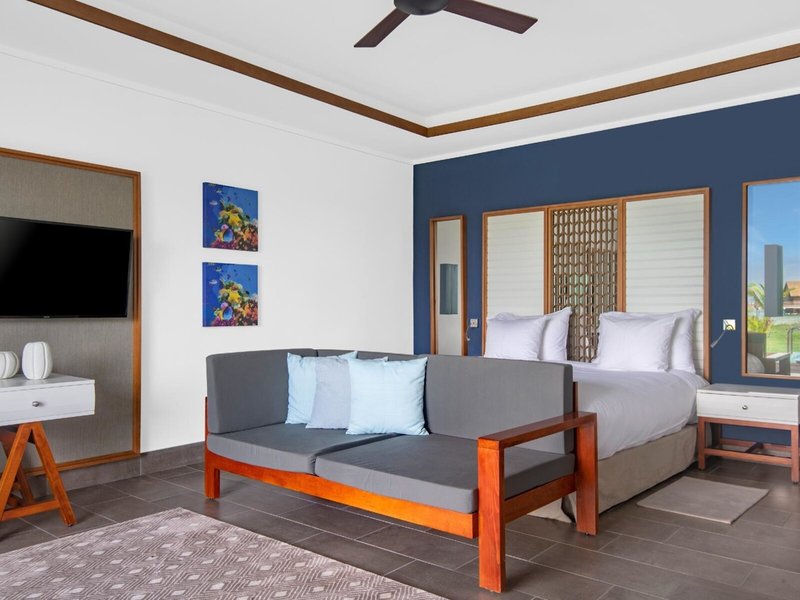 - Deluxe Pool View (DZX2), Juniorsuite, Nichtraucherzimmer, Mindestalter im Zimmer: 13 Jahre, Poolseite, Gartenseite, Meerblick, Poolblick, Blick auf all Hotel grounds, ca. 62 m², letzte Komplettrenovierung 2019, kombiniertes Wohn-/Schlafzimmer, 1 Schlafzimmer, 1 Einzelbett (200x200cm), 1 Doppelbett (200x200cm), 1 King Size Bett (200x200cm), Babybett: Anfrage notwendig, Moskitonetz, Klimaanlage: individuell regelbar, Fußboden: Fliesenboden, Safe, Deckenventilator, Standventilator, Sitzecke, Sofa, Schreibtisch, Bügeleisen, Bügelbrett, Kaffee-/Teezubereiter, Minibar: gegen Gebühr, Softdrinks: gegen Gebühr, Wasser: ohne Gebühr, alkoholische Getränke: gegen Gebühr, Snacks: gegen Gebühr, Minibarauffüllung, Telefon, Internet: WLAN/WiFi: ohne Gebühr, Fernseher: Flatscreen, Kabel-TV, Reinigungsservice: ohne Gebühr, Badewanne oder Dusche, separate Dusche, Regendusche, Bademantel, Slipper, Föhn, Kosmetikspiegel, Balkon: mit Sitzgelegenheit