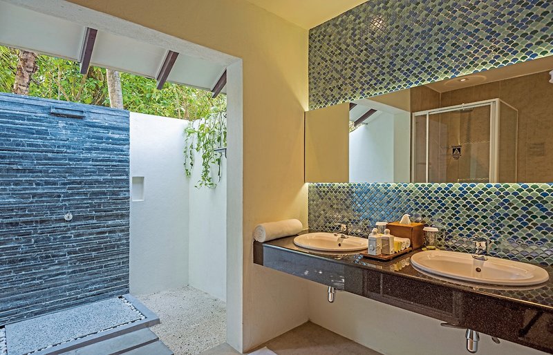 - 91-100 qm, Villa, mit Verbindungstür, 2 separate Schlafzimmer, 2 Bäder, nach oben halb offenes Bad, Dusche, Außendusche, WC, Haartrockner, Holzboden, Klimaanlage, Ventilator, Minibar, Auffüllung täglich, Softdrinks, Bier, Säfte, Wasser, Safe, TV, WLAN, Wasserkocher, Espressomaschine, Kaffee/Tee, Terrasse (möbliert)