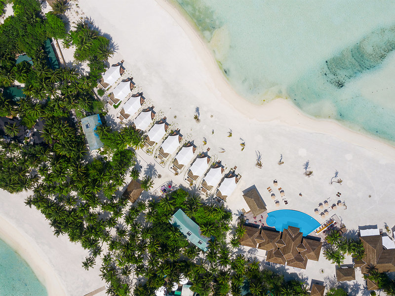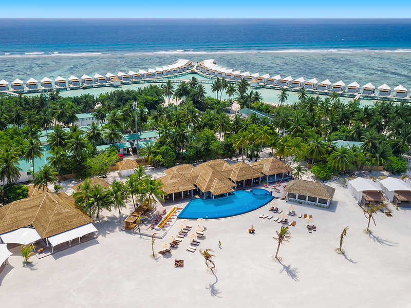Lage: Das Resort befindet sich im Meemu Atoll, eingebettet in die beeindruckenden Blautöne der Lagune, und erstreckt sich über zwei Inseln (380 x 170 m), die durch einen Steg verbunden sind. Das Hausriff, rund 900 m vom Resort entfernt, ist ideal zum Schnorcheln und Tauchen. Die Fahrt mit dem Schnellboot vom internationalen Flughafen Male dauert ca. 120 Minuten, der Transfer mit dem Wasserflugzeug ist gegen Aufpreis verfügbar.