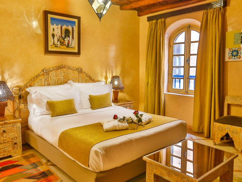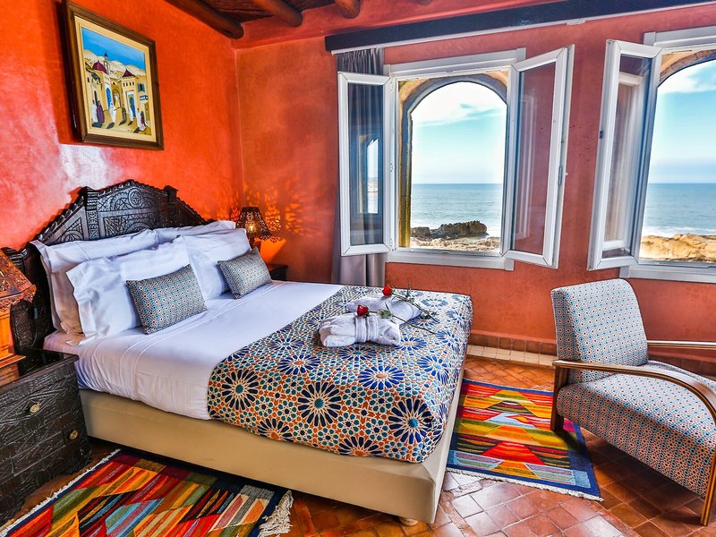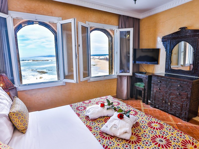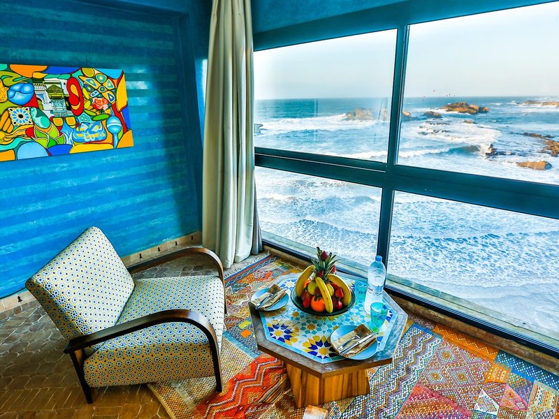 Lage & Umgebung Das Hotel liegt am Ende der Medina im Viertel Sandillon, benannt nach dem Erbauer der ersten Windmühle von Essaouira. Es liegt neben dem Sqala und den Schlossmauern von Essaouira, direkt am Meer. Restaurants und Einkaufsmöglichkeiten liegen ganz in der Nähe des Hotels, und zum Strand benötigt man zu Fuß nur etwa 15 min.