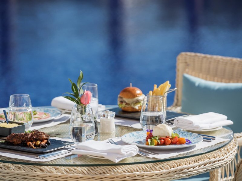 - Restaurant „Azur“: Küche: international, mediterran, leichte Gerichte: gegen Gebühr, à la carte, Anfrage & Reservierung notwendig, gegen Gebühr, täglich, am Pool, Raucherbereich
