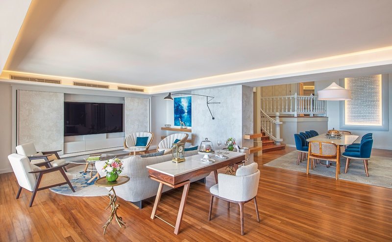 - 151-200 qm, Suite, Meerblick, Gartenblick, 1 separates Schlafzimmer, Ankleidebereich, Dusche, Badewanne, separates WC, Bademantel, Haartrockner, Klimaanlage, Minibar, Softdrinks, Bier, Safe, TV, WLAN, Kaffee/Tee, Terrasse (möbliert, teilweise überdacht)