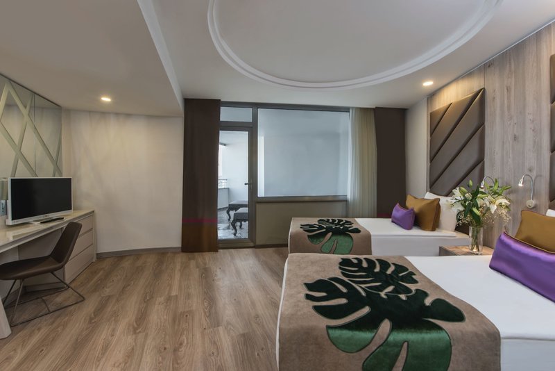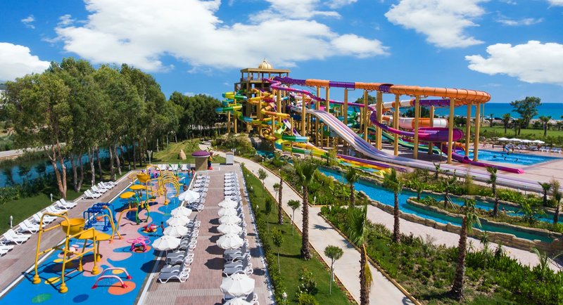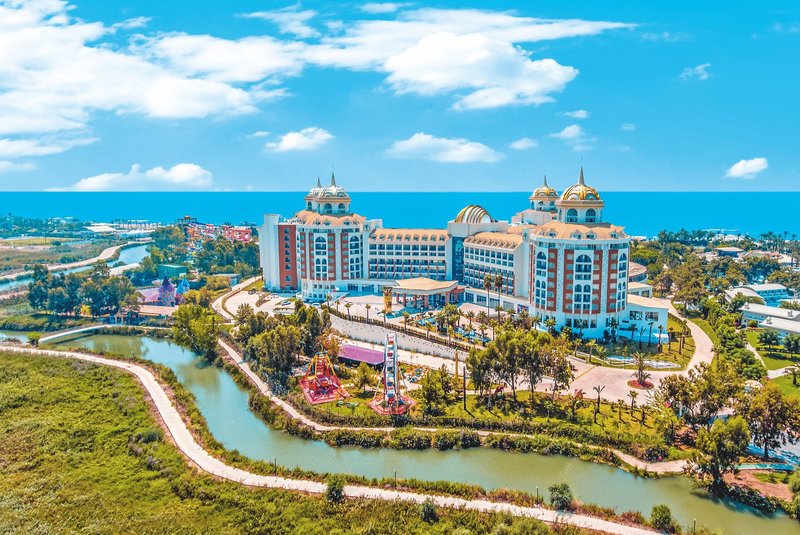 Vybavenie: Tento priestranný rekreačný rezort ponúka celkovo 837 izieb rozmiestnených v deväťposchodovej hlavnej budove so štyrmi krídlami (19 výťahov, vrátane 7 panoramatických). Medzi mnohé vybavenie patrí štýlovo navrhnutá vstupná hala s recepciou, príjemnými posedeniami a lobby barom, hlavná reštaurácia s priestrannou vonkajšou terasou, niekoľko reštaurácií à la carte (jedno bezplatné jedlo à la carte na pobyt v každej reštaurácii, s predchádzajúcou rezerváciou a v závislosti od dostupnosti), rôzne bary, cukráreň, konferenčné miestnosti, malé kino, nočný klub, moderný krytý bazén (otvorený počas zimnej sezóny) a dobre vybavené wellness centrum. K dispozícii je tiež niekoľko obchodov a kaderníctvo (každý za poplatok). Wi-Fi je bezplatné v celom rezorte a na izbách. V krásne upravených záhradách vedľa amfiteátra, kde sa môžete zabaviť večer, nájdete atraktívne navrhnutý bazén so samostatným detským bazénom, vírivku, ďalší bazén s deviatimi toboganmi pre dospelých a siedmimi toboganmi pre deti a slnečné terasy s barom pri bazéne. Tu a na pláži s plážovým barom a mólom sú ležadlá, slnečníky a plážové osušky poskytované bezplatne.