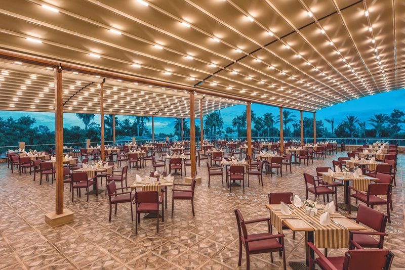Ausstattung: Das großzügig angelegte Feriendomizil bietet insgesamt 837 Zimmer, die sich auf ein neunstöckiges Haupthaus mit vier Blöcken (19 Lifts, davon 7 Panoramaaufzüge) verteilen. Zu den vielen Annehmlichkeiten zählen die schick gestaltete Empfangshalle mit Rezeption, einladende Sitzgruppen und Lobbybar, das Hauptrestaurant mit großzügiger Außenterrasse, diverse À-la-carte-Restaurants (einmal pro Aufenthalt in jedem der À-la-carte-Restaurants inkl., mit Voranmeldung, nach Verfügbarkeit), verschiedene Bars, eine Patisserie, Konferenzräume, ein kleines Kino, Diskothek, das moderne Hallenbad (in der Wintersaison geöffnet) und ein gut ausgestattetes Wellness-Zentrum. Außerdem diverse Geschäfte und ein Friseur (jeweils gegen Gebühr). In der gesamten Anlage und in den Zimmern ist Wi-Fi kostenlos. In der schön begrünten Gartenanlage neben dem Amphitheater für die Abendunterhaltung auch die ansprechend gestaltete Swimmingpool mit separatem Kinderbecken, Whirlpool, einem weiteren Becken mit neun Wasserrutschen für Erwachsene und sieben Wasserrutschen für Kinder und die Sonnenterrassen mit Poolbar. Hier und am Strand, mit Beachbar und Badesteg, sind Liegen, Sonnenschirme und Badetücher kostenlos.