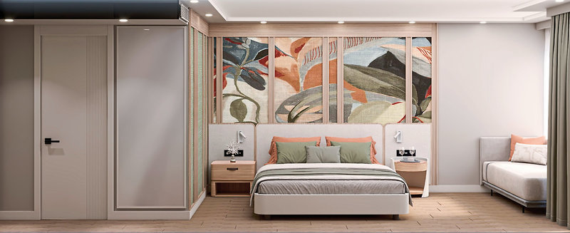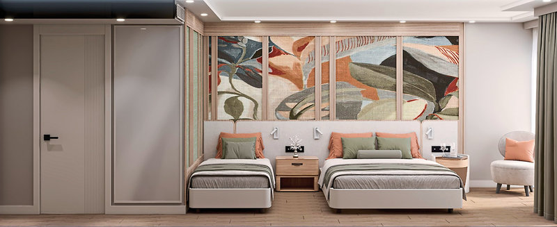 - 26-30 qm, Doppel, Meerblick, Couch, 1 Einzelbett, 1 Doppelbett, 1 Bad, Dusche, Haartrockner, Laminatboden, Klimaanlage, zentral gesteuert, Minibar, Auffüllung regelmäßig, Safe, 1 TV (Sat-TV), Balkon, Anzahl Zimmer: 102
