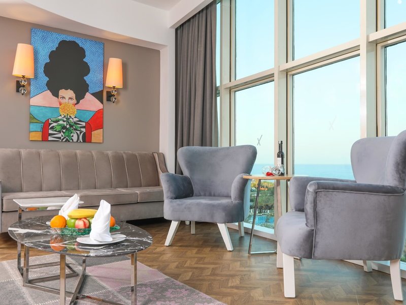 - Junior Jacuzzi Suite (JSM1), Juniorsuite, Nichtraucherzimmer, im Hauptgebäude, Meerblick, Fußboden: Laminat, Safe: ohne Gebühr, Minibar: ohne Gebühr, Softdrinks: ohne Gebühr, Wasser: ohne Gebühr, Minibarauffüllung: täglich, Telefon, Internet: WLAN/WiFi: ohne Gebühr, Fernseher: deutsches Programm, Sat-TV, Roomservice: täglich, gegen Gebühr, Reinigungsservice: täglich, gegen Gebühr, Badewanne, WC, Slipper: ohne Gebühr, Balkon, Balkon oder Terrasse