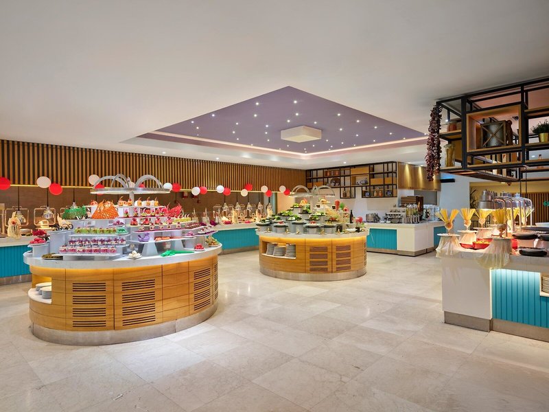 - Hauptrestaurant „BELLAZURE RESTAURANT“: ab 1 Jahr, Küche: international, türkisch, glutenfreie Gerichte, vegetarische Gerichte, Buffet, Showcooking, ohne Gebühr, bei All Inclusive inklusive, April - Oktober, täglich 07:00 Uhr - 11:00 Uhr, täglich 12:30 Uhr - 14:30 Uhr, täglich 19:00 Uhr - 21:30 Uhr, täglich 23:00 Uhr - 00:00 Uhr, mit Terrasse, Raucherbereich, angemessene Kleidung erwünscht