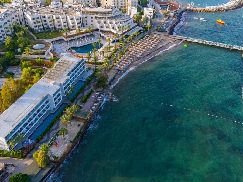 Poloha: Priamo na mierne svahovitej pláži (piesok zmiešaný s jemným štrkom) s mólom na kúpanie. Turgutreis je vzdialený asi 1 km, Bodrum s ďalšími nákupnými a zábavnými možnosťami je vzdialený asi 20 km.