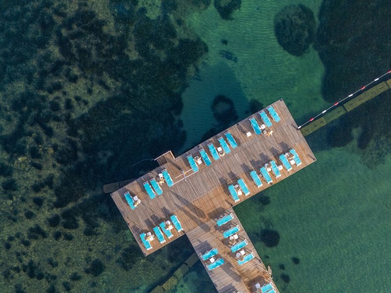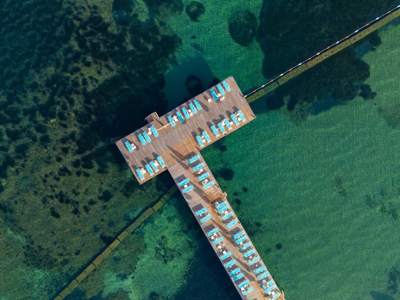 Lage: Direkt am flach abfallenden Strand (Sand, mit feinem Kies durchsetzt) mit Badesteg. Turgutreis liegt ca. 1 km entfernt, Bodrum mit weiteren Einkaufs- und Unterhaltungsmöglichkeiten ca. 20 km.