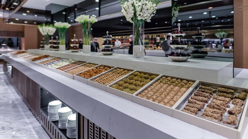 Essen und Trinken: Frühstück (von 07:00 - 10:00 Uhr) vom Buffet. All Inclusive: Frühstück, Mittag- und Abendessen. Frühstück, Mittag- und Abendessen dabei nur in ausgewählten Restaurants. Wasser, Softdrinks, Kaffee/Tee, Bier, Wein, nationale alkoholische Getränke und Cocktails zu bestimmten Service-Zeiten. Kuchen/Gebäck (10:00 - 18:00 Uhr), ausgewählte importierte Spirituosen (09:00 - 22:00 Uhr, limitiert und in speziellen Bars und Restaurants), Spätaufsteher-Frühstück (10:00 - 11:00 Uhr), kleine Snacks (12:00 - 16:00 Uhr), Mitternachtssnacks (00:00 - 02:00 Uhr), Willkommensdrink, kostenloses Internet und kostenlose Minibar auf dem Zimmer (limitiert).