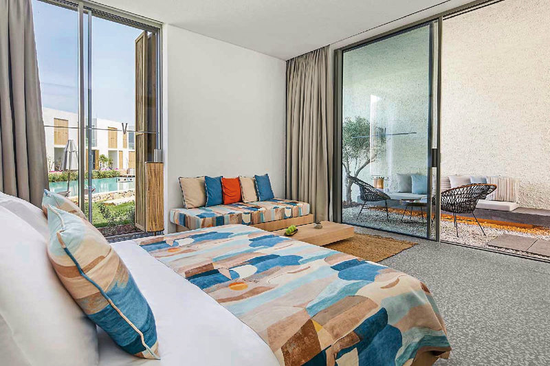 - 91-100 qm, Familien, Gartenblick, Poolblick, 2 separate Schlafzimmer, 2 Einzelbetten, Doppelbett, 2 Bäder, Dusche, 2 WCs, Bademantel, Badeslipper, Haartrockner, Fliesen, Klimaanlage, Minibar, Safe, TV (Sat-TV, Flachbildschirm), Wasserkocher, Kaffeemaschine, Kaffee/Tee, direkter Poolzugang, Gemeinschaftspool, hochwertige Badartikel, Aufdeck-Service, bei Ankunft im Zimmer Obstkorb, Wein, Terrasse oder Wintergarten