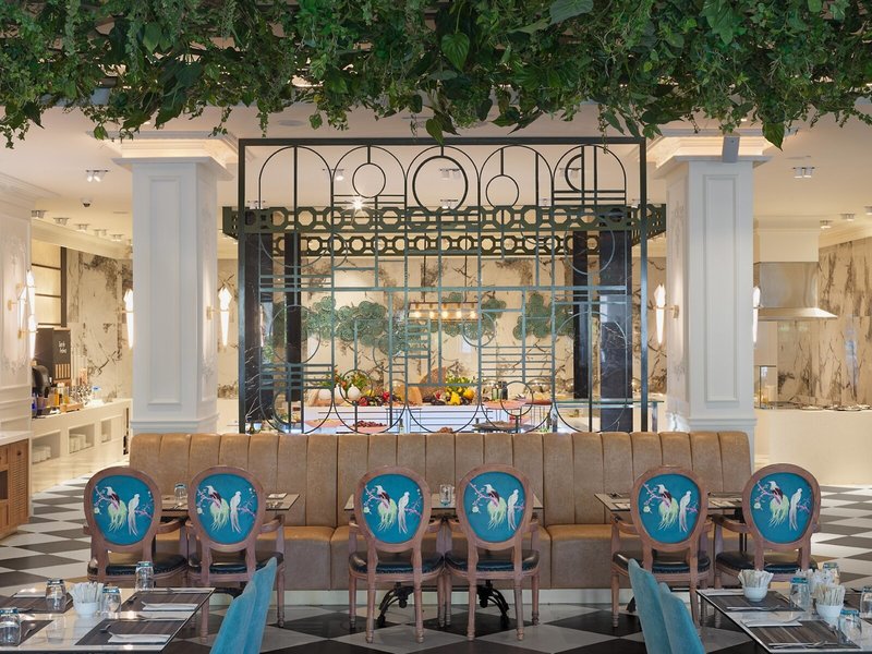 - Hlavná reštaurácia The Palms Restaurant: Kuchyňa: medzinárodná, grilované jedlá, bezlepkové jedlá: za poplatok, zahrnuté v all inclusive, potrebné vyžiadanie, rezervácia nie je potrebná, detské menu: za poplatok, zahrnuté v all inclusive, potrebné vyžiadanie a rezervácia nie sú potrebná, ľahké jedlá: za poplatok, zahrnuté v all inclusive, potrebné vyžiadanie a rezervácia nie sú potrebná, vegetariánske jedlá: za poplatok, zahrnuté v all inclusive, potrebné vyžiadanie a rezervácia nie sú potrebná, bufet, show cooking, potrebné vyžiadanie a rezervácia nie sú potrebná, za poplatok, zahrnuté v all inclusive, máj - október, Po.-Pia. 7:00 – 10:30, sobota, nedeľa 7:00 - 11:00, denne 12:30 - 15:00, denne 19:00 - 22:30, fajčiarska zóna, detská stolička