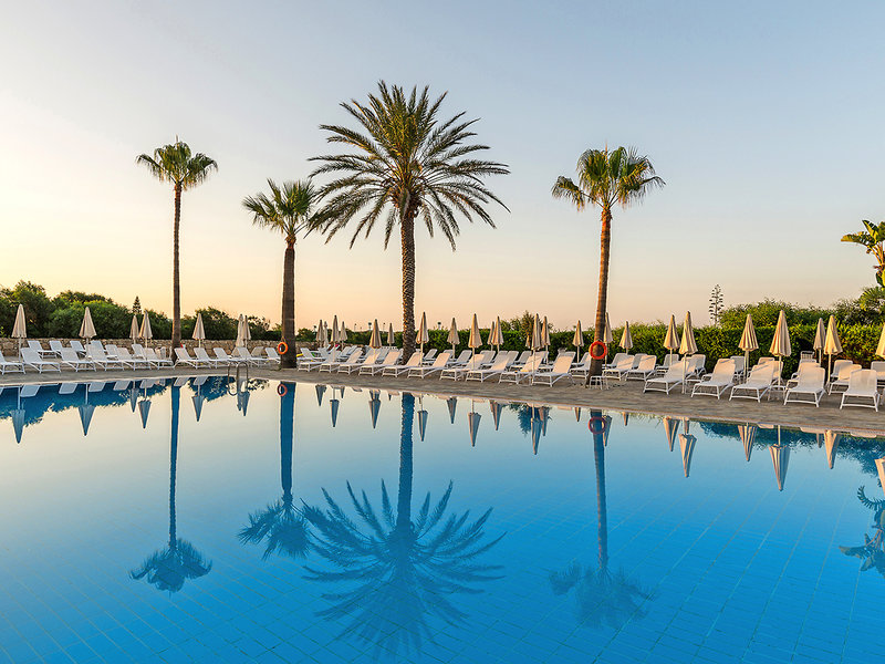 Ausstattung: Inmitten einer wunderschönen Gartenanlage mit Süßwasserswimmingpool, Kinderpool, Sonnenterrasse, Sonnenliegen und Schirme (am Strand gegen Gebühr), Badetücher, Poolbar/Restaurant. Empfangsbereich, Rezeption, WLAN, Restaurant mit Außenterrasse (internationale Küche), Taverne "Nissi", Cocktailbar und Strandbars (saison- und wetterabhängig geöffnet), Hallenbad, Friseur, Souvenirshop, Kiosk am Strand. Landeskategorie: 4 Sterne, 270 Zimmer, 4 Etagen.