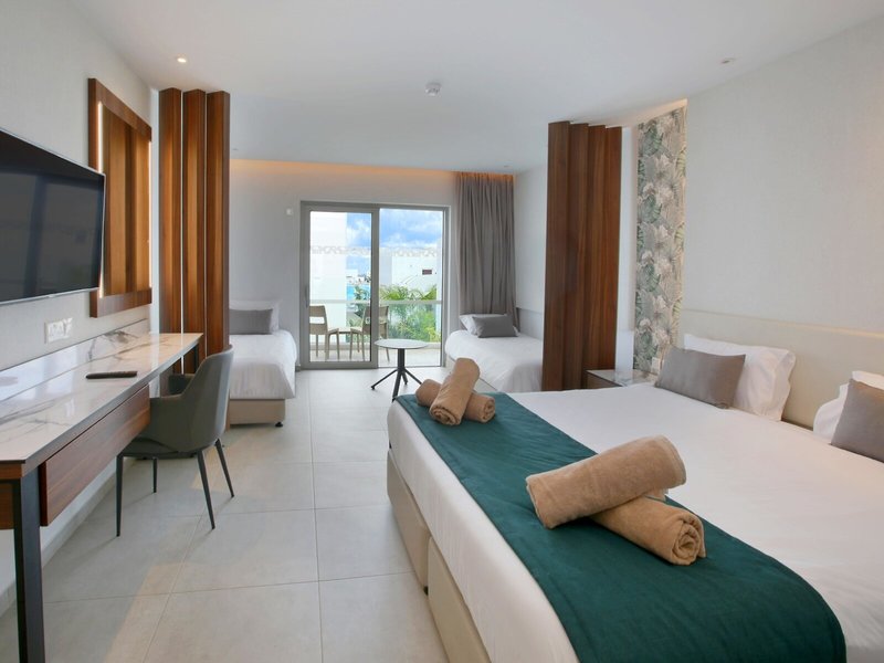 - Family Room (DZX3), Familienzimmer, Nichtraucherzimmer, Landblick, ca. 33 - 33 m², letzte Komplettrenovierung 2022, letzte Teilrenovierung 2022, Gesamtanzahl der Räume in diesem Zimmertyp: 1, Aufteilung wie folgt: 1 Schlafzimmer, Babybett: ohne Gebühr, Klimaanlage: ohne Gebühr, individuell regelbar, Fußboden: Fliesenboden, Safe: ohne Gebühr, Schreibtisch, Kühlschrank: ohne Gebühr, Nespressomaschine, Kaffee-/Teezubereiter, Wasserkocher, Minibar: Wasser: ohne Gebühr, bei All Inclusive inklusive, Telefon, Internet: WLAN/WiFi: ohne Gebühr, Fernseher: Flatscreen, im Schlafzimmer, deutsches Programm, Deutsche Welle, Sat-TV, Reinigungsservice: ohne Gebühr, bei All Inclusive inklusive, Dusche, Regendusche, WC, Föhn, Kosmetikspiegel, Balkon: mit Sitzgelegenheit