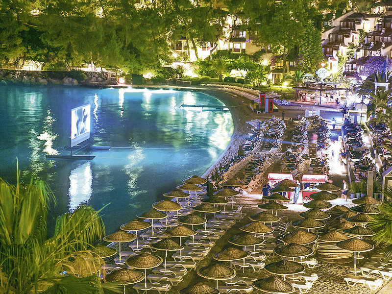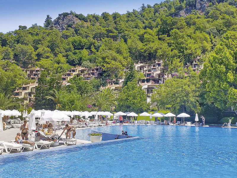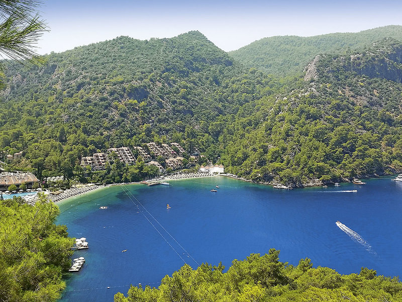 Lage: Direkt an einer abgeschiedenen Badebucht mit 3 hoteleigenen Kiesstränden (2x ab 16 J.) m. Badestegen u. Badeplateaus. Bis ins Zentrum von Fethiye sind es ca. 4 km (Hotelshuttle gegen Gebühr).