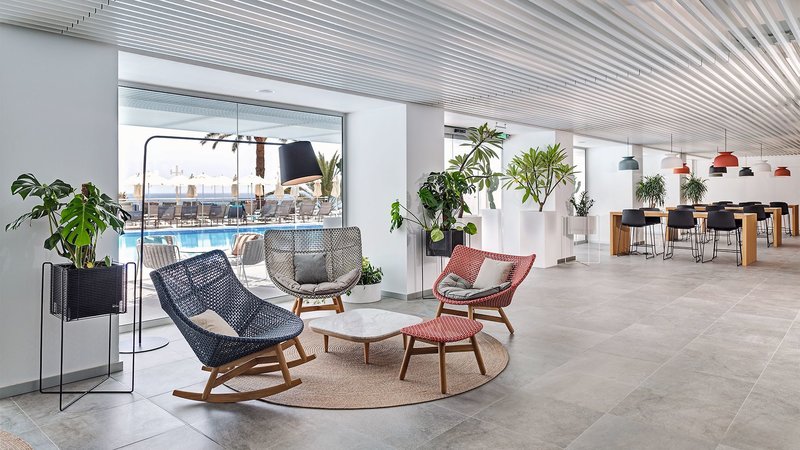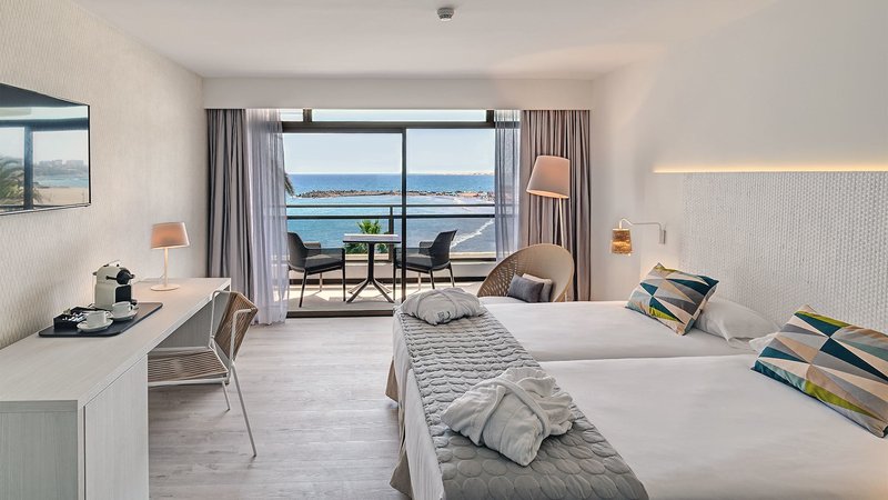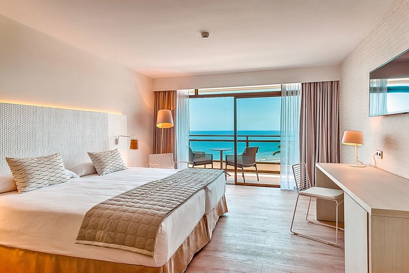 Dvojlôžkové izby s výhľadom na pláž/more: Sú vybavené rovnako ako dvojlôžkové izby s výhľadom na more, ale nachádzajú sa na prízemí a majú terasu s preskleným priečelím orientovaným na promenádu a výhľadom na pláž, čiastočne obmedzený výhľad na more (kvôli palmám/rastlinám).