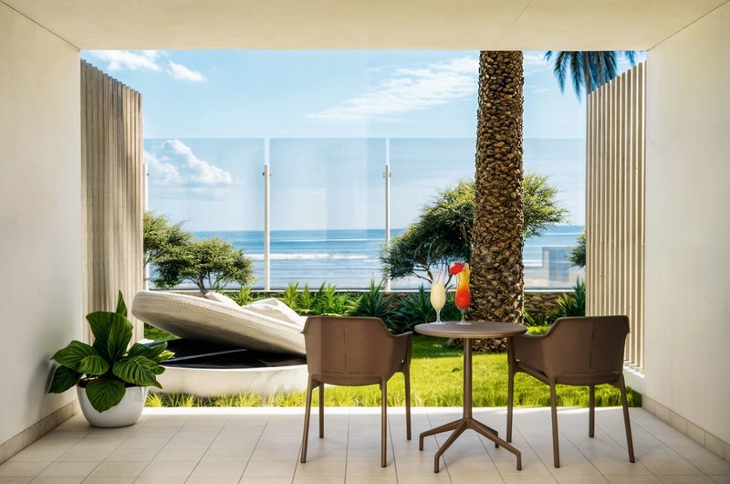 Doppelzimmer Strandblick/Meerblick: Sind gleich ausgestattet wie die Doppelzimmer Meerblick, liegen jedoch im Erdgeschoss und verfügen über eine Terrasse mit Glasfront zur Promenade und Blick zum Strand, teilweise eingeschränkten Meerblick (durch Palmen-/Pflanzenbestand).