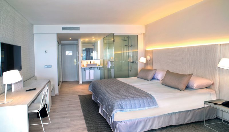 Doppelzimmer Meerblick: Die großzügigen Zimmer bieten eine Klimaanlage, Sat.-TV-Flachbildschirm, Telefon, Minibar (leer), Safe (gratis), ein offenes Badezimmer mit Dusche/WC und einer Glasfront zum Schlafbereich sowie einen möblierten Balkon mit Meerblick (DM)