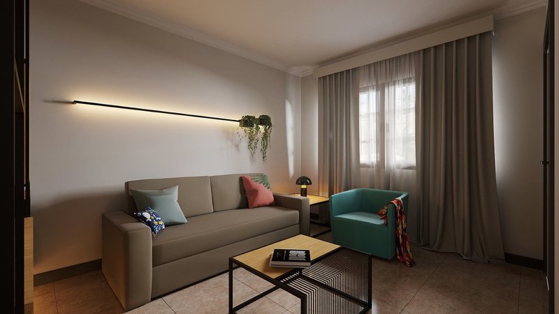 Rodinný apartmán: Vybavený rovnako ako apartmány s 1 spálňou, ale so sprchovacím kútom a navyše s kútikom na kávu/čaj, zásobeným minibarom s nealkoholickými nápojmi pri príchode, detskými dekoráciami a malým herným stanom a 2 ležadlami na terase (2FS).