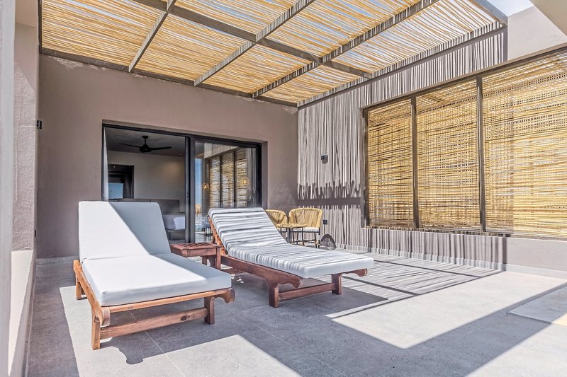 - 51-60 qm, Juniorsuite, Doppelbett, Sofabett, Dusche, Badewanne, Haartrockner, Kosmetikspiegel, Klimaanlage, Mini-Kühlschrank, Safe, TV, Terrasse (möbliert), direkter Poolzugang