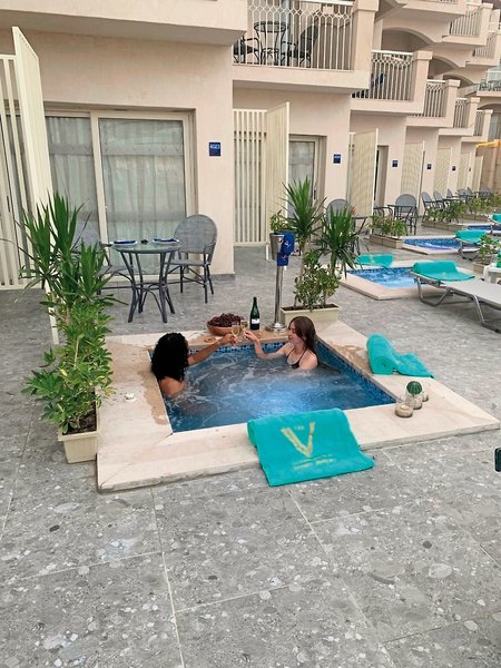 - 41-45 qm, Doppel, für Erwachsene ab 16 Jahre, Deluxe, Erdgeschoss, Poolblick, Doppelbetten (1 Kingsize oder 1 Twin), Dusche, Haartrockner, Kosmetikspiegel, Klimaanlage, Minibar, Auffüllung bei Anreise, Safe, TV (Sat-TV), WLAN, Wasserkocher, Kaffee/Tee, Terrasse (möbliert), Whirlpool, hochwertige Badartikel, Aufdeck-Service, bei Ankunft im Zimmer Obstkorb, Wein