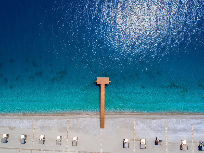 - Strand „Long Beach“: Sand, feinsandig, Kies, privat, hoteleigen, Liegen, Sonnenschirme