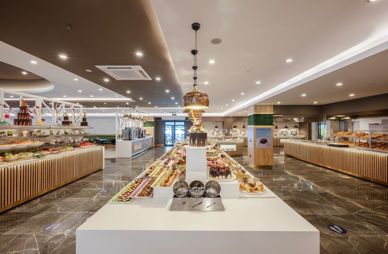 Ausstattung: Komfortables Ferienhotel. Haupthaus, 4 Wohngebäude. Garten, Pool, Wasserrutschen, Sonnenterrassen, Pool-/Snackbar. Liegen, Schirme, Auflagen, Badetücher. Empfangshalle, Rezeption, WLAN im gesamten Hotel inklusive, Lobby, Aufenthaltsraum, Hauptrestaurant mit Terrasse, 2 À-la-carte-Restaurants (gegen Gebühr), Gamecenter, Geschäfte, Friseur, Patisserie, Diskothek, Amphitheater. Landeskategorie: 5 Sterne, 324 Zimmer, 1-4 Etagen, 4 Lifte.