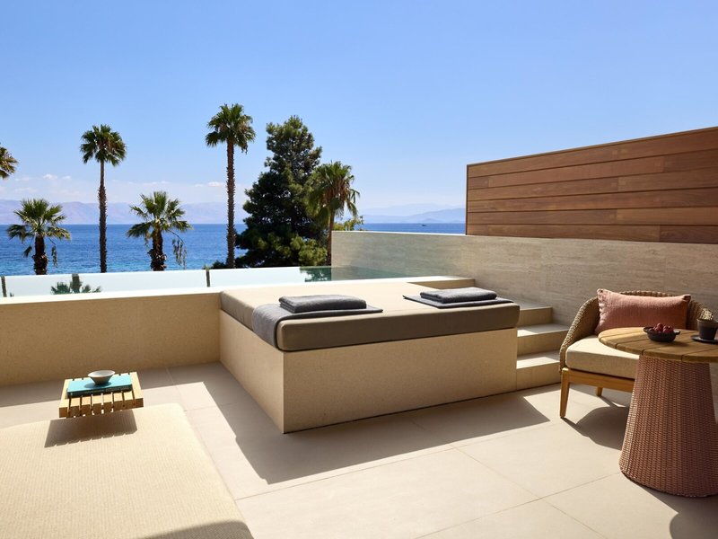 - Deluxe Double Room Sea View with Private Pool (DZM4), Doppelzimmer, Nichtraucherzimmer, Mindestalter im Zimmer: 6 Jahre, im Hauptgebäude, Meerseite, Meerblick, Blick auf Sea, ca. 25 m², letzte Komplettrenovierung 2025, Gesamtanzahl der Räume in diesem Zimmertyp: 1, Aufteilung wie folgt: 1 Schlafzimmer, 1 King Size Bett (180x200cm), Klimaanlage: ohne Gebühr, individuell regelbar, kalt, warm, Safe: ohne Gebühr, Espressomaschine, Nespressomaschine, Kaffee-/Teezubereiter, Wasserkocher, Minibar: gegen Gebühr, Softdrinks: gegen Gebühr, Wasser: gegen Gebühr, alkoholische Getränke, Minibarauffüllung, Telefon, Internet: WLAN/WiFi: ohne Gebühr, Fernseher: Flatscreen, im Schlafzimmer, Sat-TV, Roomservice: gegen Gebühr, Reinigungsservice: ohne Gebühr, Regendusche, WC, Föhn, Balkon: mit Liegestühlen, mit Sitzgelegenheit, Balkon oder Terrasse: mit Private Pool