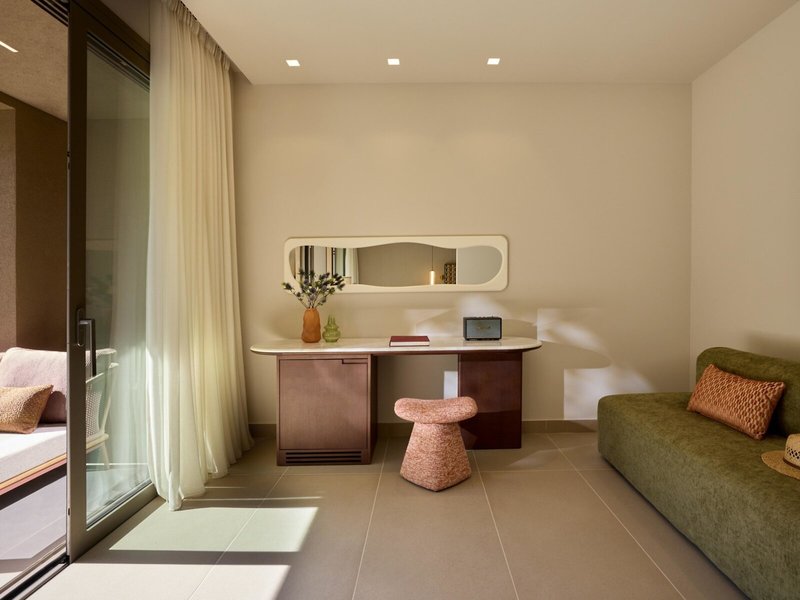 - Rooftop Junior Suite Sea View (JSM2), Juniorsuite, Nichtraucherzimmer, Mindestalter im Zimmer: 6 Jahre, im Hauptgebäude, Meerseite, Meerblick, Blick auf Sea, ca. 34 m², letzte Komplettrenovierung 2025, Gesamtanzahl der Räume in diesem Zimmertyp: 1, Aufteilung wie folgt: kombiniertes Wohn-/Schlafzimmer, 1 King Size Bett (180x200cm), 1 Schlafsofa, Klimaanlage: ohne Gebühr, individuell regelbar, kalt, warm, Safe: ohne Gebühr, Schreibtisch, Kaffeemaschine, Espressomaschine, Nespressomaschine, Kaffee-/Teezubereiter, Wasserkocher, Minibar: gegen Gebühr, Softdrinks: gegen Gebühr, Wasser: gegen Gebühr, alkoholische Getränke: gegen Gebühr, Minibarauffüllung, Telefon, Internet: WLAN/WiFi: ohne Gebühr, Fernseher: Flatscreen, im Schlafzimmer, Sat-TV, Roomservice: gegen Gebühr, Reinigungsservice: ohne Gebühr, Regendusche, WC, Föhn, Kosmetikspiegel, Balkon oder Terrasse: mit Liegestühlen, mit Sitzgelegenheit