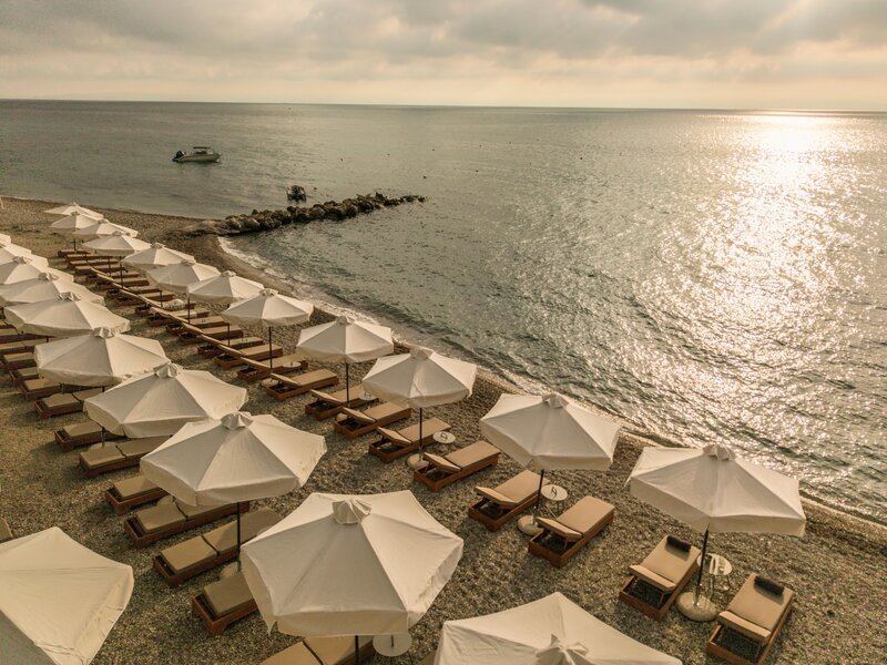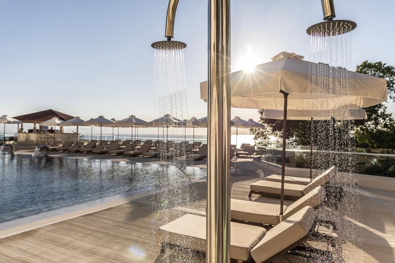 Ausstattung: Ansprechend gestaltetes, in 2024/25 renoviertes Komforthotel mit Blick über das Ionische Meer. Terrassenförmig angelegt, inmitten einer weitläufigen Außenanlage mit 2 Swimmingpools, 1 Kinderpool. Sonnenterrassen mit Liegen, Schirme am Pool/Strand, Pool-/Snackbar und Beachbar. Stilvolle Empfangshalle, Rezeption, Restaurant, Bar, Bibliothek. Landeskategorie: 5 Sterne, 201 Zimmer, 2 Lifte im Hauptgebäude (6 Etagen).