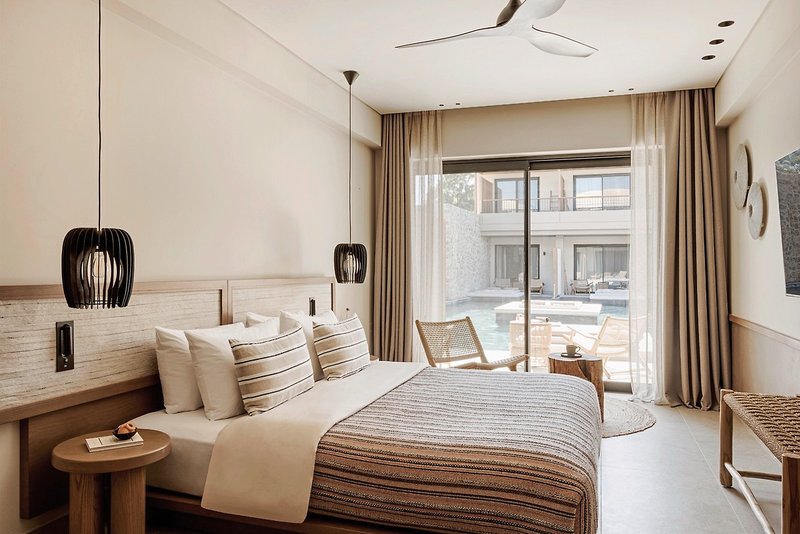 - 29 qm, Juniorsuite, Poolblick, Nichtraucher, Doppelbett (Kingsize), Dusche, Bademantel, Haartrockner, Klimaanlage, Minibar kostenpflichtig, Safe, TV (Sat-TV), Espressomaschine, Kühlschrank, Balkon oder Terrasse, Privatpool