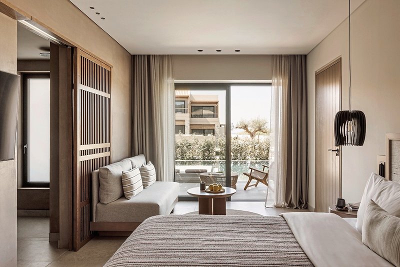 - 29 qm, Juniorsuite, Poolblick, Nichtraucher, Doppelbett (Kingsize), Dusche, Bademantel, Haartrockner, Klimaanlage, Minibar kostenpflichtig, Safe, TV (Sat-TV), Espressomaschine, Kühlschrank, Balkon oder Terrasse, Privatpool