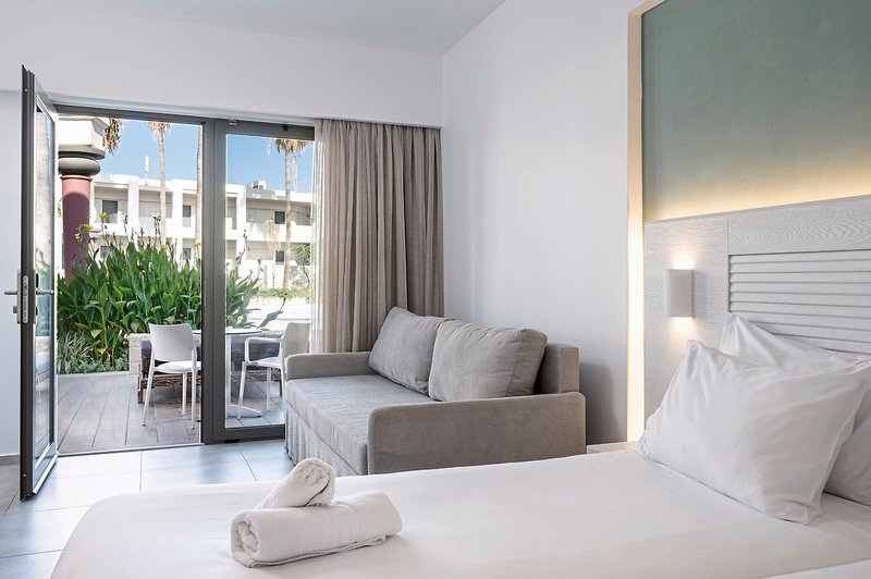 - 26-30 qm, Familien, Deluxe, Poolblick, Hauptgebäude oder Nebengebäude, renoviert (2022), Twinbett, Sofabett, Dusche, Haartrockner, Klimaanlage, individuell regulierbar, Mini-Kühlschrank, Safe, TV (Sat-TV), WLAN, kostenpflichtig, Kaffee/Tee, Terrasse (möbliert)