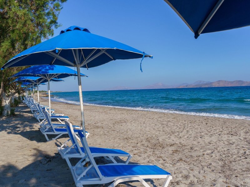 - Strand „Tigaki Area“: Sand, öffentlich, Liegestühle: gegen Gebühr