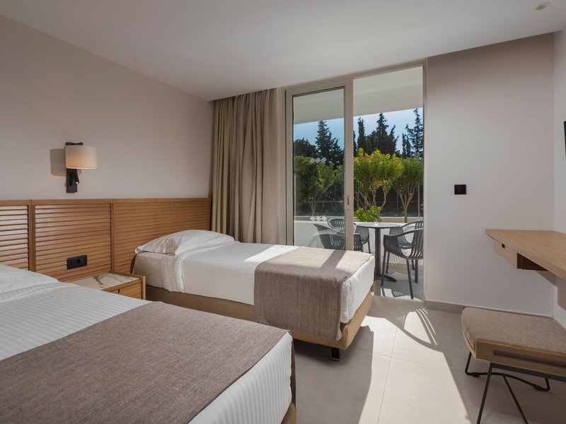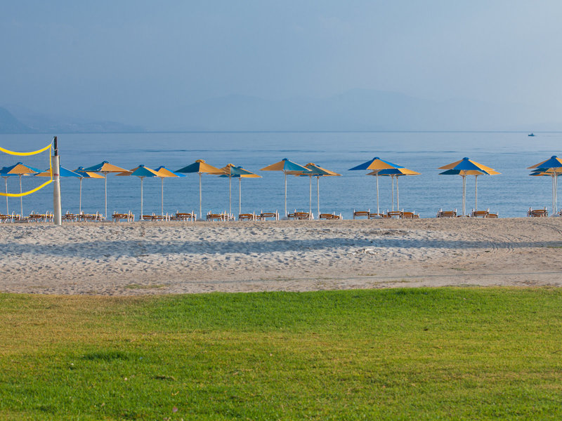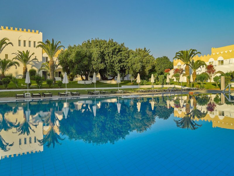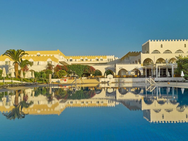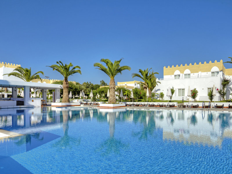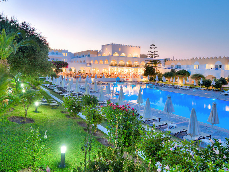 Ausstattung: Poollandschaft mit 2 Pools, Kinderpool. Liegen, Schirme, Handtücher am Pool und am Strand (geg. Geb.), Pool-/Snackbar. Empfangshalle, Rezeption, Lobby-Bar, TV-Lounge. Restaurant (Buffet & à la carte) mit Terrasse, 3 Bars, Minimarkt, Parkplatz (geg. Geb.). 221 Zimmer, 2 Etagen, 3 Nebengebäude, Lift.