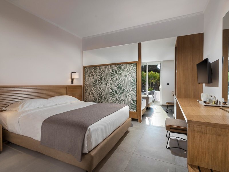Ubytovanie: Dvojlôžková izba Deluxe (balkón alebo terasa, výhľad do záhrady, dve samostatné postele): Minichladnička (za poplatok). Kanvica, uteráky. TV, telefón, internet (za poplatok), trezor (za poplatok). Vaňa/sprcha, WC, sušič vlasov, župan. Max. 3 dospelí.