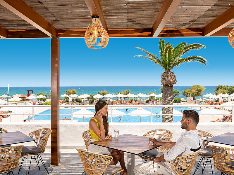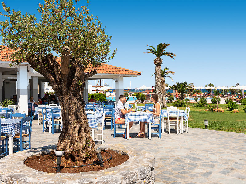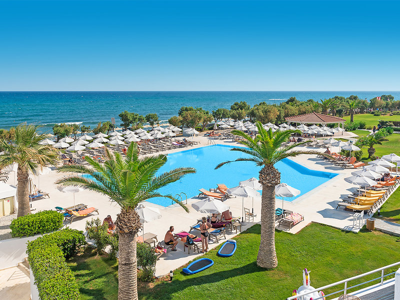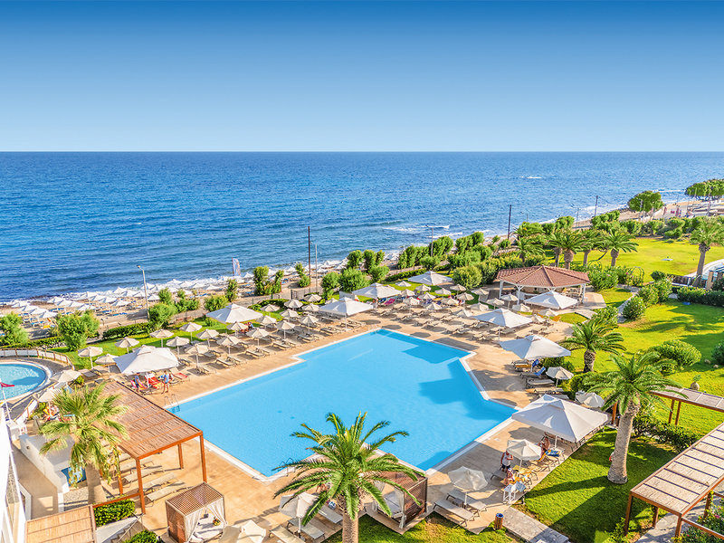 Ankommen und sich wohlfühlen – die im kretischen Dorfstil erbaute Ferienanlage lädt mit großzügigem Garten und freundlichem Service zum Entspannen unter Palmen ein. Von hier aus haben Sie einen traumhaften Blick über die türkisblaue Ägäis. Relaxen Sie oder nutzen Sie das umfangreiche Wellness-, Fitness- und Sportprogramm.