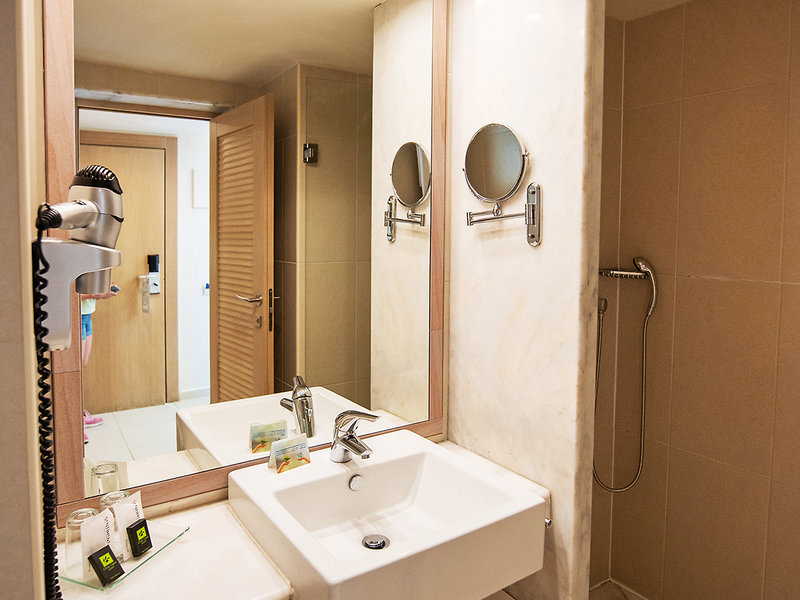 Ubytovanie: Dvojlôžková izba (DZG, cca 22-26 m²), dobre zariadená, klimatizácia (teplo/chladenie), mini chladnička, TV, telefón, Wi-Fi, trezor na prenájom. Kúpeľňa so sprchovacím kútom, toaletou a sušičom vlasov. Balkón/terasa. Voliteľný bočný výhľad na more (DSM) alebo výhľad na more (DZM). Max. 2E+1K