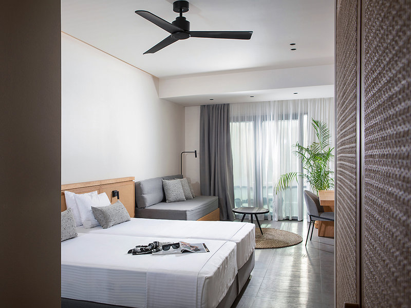 Wohnen: Superior-Doppelzimmer (DSP, ca. 27 qm), Klimaanlage, Minikühlschrank, TV, WLAN (inkl.), Telefon, Mietsafe. Bad, WC und Föhn. Balkon oder Terrasse mit seitlichem Meerblick. Max. 3E+1K