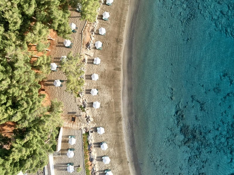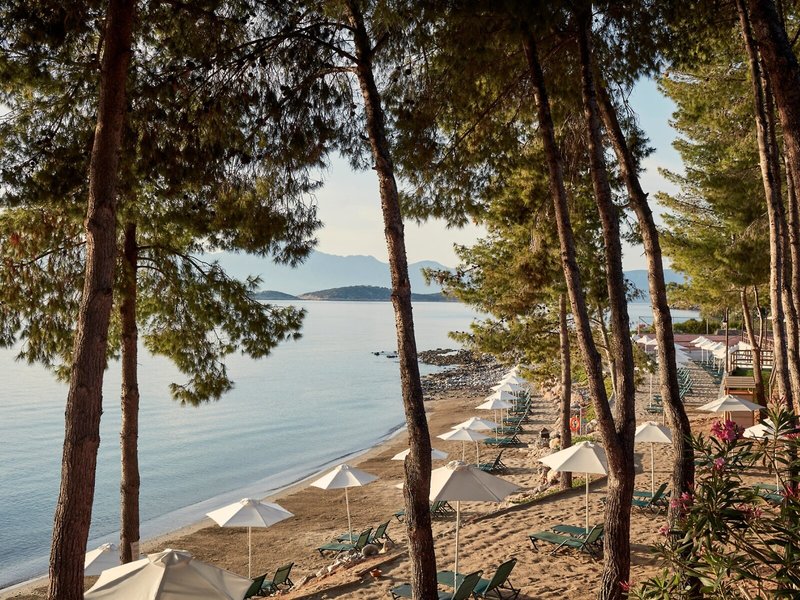 - Strand: Sand, Kies, flach abfallend, naturbelassen, Treppen zum Strand, hoteleigen, Liegestühle, Sonnenschirme