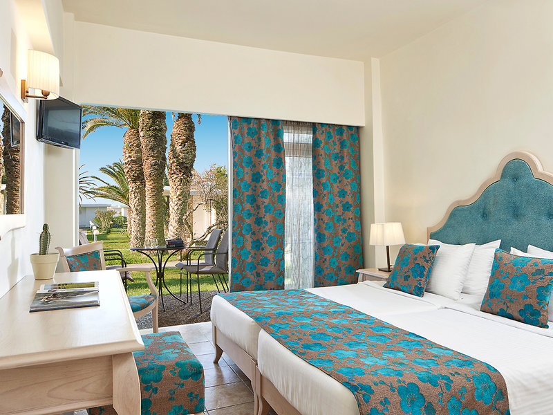 Doppelzimmer (BUM, ca. 17-20 qm; unter HER549), im Haupt- oder Bungalowgebäude, Klimaanlage, Minikühlschrank, Telefon, TV, WLAN, Mietsafe. Bad/Dusche, WC, Föhn. Balkon/Terrasse mit Meerblick. Max. 2E