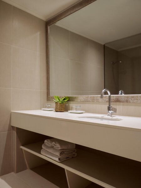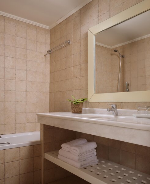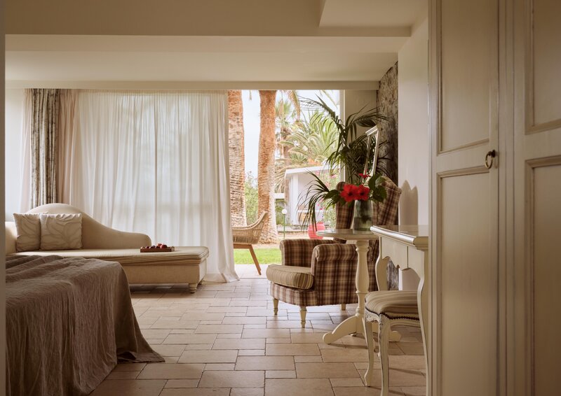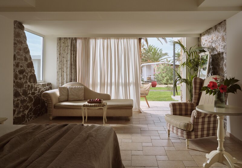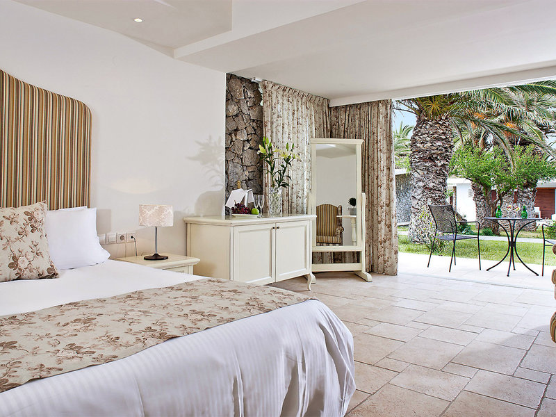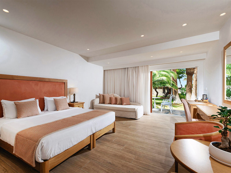 Juniorsuiten (JS, ca. 35 qm; unter HER549), Klima, Minikühlschrank, TV, WLAN, Mietsafe. Dusche, WC und Föhn. Terrasse mit Meerblick, in Strandnähe. Max. 4E