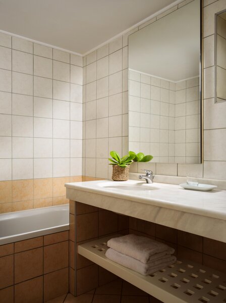 Ubytovanie: Dvojlôžková izba (cca 17 m²), klimatizácia, minichladnička, telefón, TV, Wi-Fi, trezor na prenájom. Sprcha, WC, fén. Balkón/terasa s výhľadom do záhrady. Max. 2 dospelí, možnosť aj pre jednu osobu (jednolôžková izba).