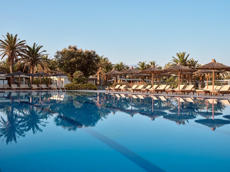 Ausstattung: Ferienanlage mit einem Hauptgebäude und mehreren Nebengebäuden. Schön angelegte, mit Palmen gesäumte Gartenanlage mit Swimmingpool mit separatem Kinderbecken. Sonnenterrassen, Liegen und Schirme am Pool und am Strand, Badetücher, Pool-/Snackbar und Restaurant, Strandbar. Empfangsbereich mit Rezeption, WLAN, Loungebar, Hauptrestaurant, 2 À-la-carte-Restaurants. Landeskategorie: 4 Sterne, 150 Zimmer.